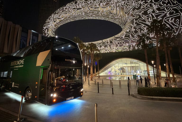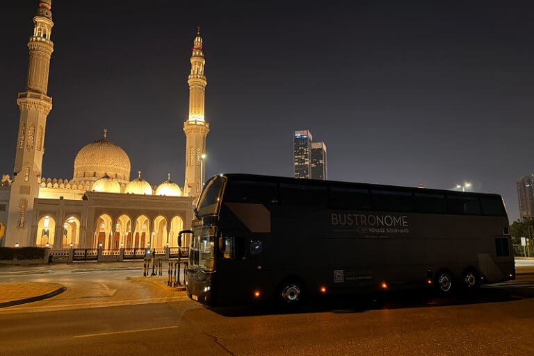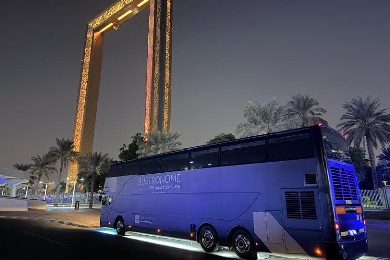 Le Bustronome Dubai est un bus à impériale haut de gamme, doté d’un toit entièrement vitré, offrant une expérience culinaire hors du commun. Il plonge ses passagers dans l’atmosphère spectaculaire de Dubaï tout en leur garantissant un confort optimal, quelle que soit la saison.